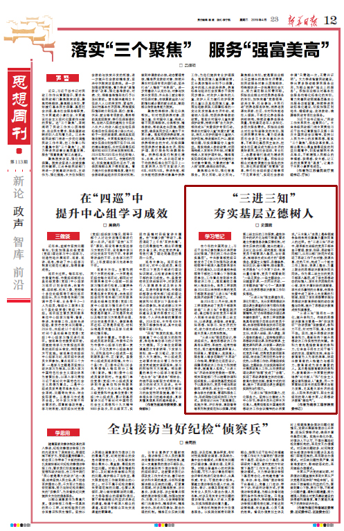 4月23日,《新华日报》思想周刊刊发永利官网党委书记史国君署名文章《“三进三知”夯实基层立德树人》。文章阐述了永利官网党员干部联系班级“三进三知”专题实践活动的鲜明特色,以及活动在推动各级领导干部把工作重心下移到学生中间、工作重点放到学生思想政治教育上,落实立德树人根本任务过程中起到的重要作用。