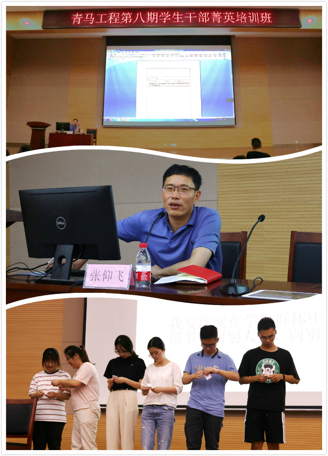 讲座中,张仰飞副院长以“按指令左右手互握”和“按指令撕纸”两个有趣的小活动导入。他指出,即使再简单的指令不同的人执行结果也是不一样的,学生干部在学习生活中应该注意创造力。他从两个方面阐述了学生干部这一角色。一是素质要求方面,他表示,学生干部是同龄人中的幸福者、辛苦者,是最具发展前景的潜力者、实干者,是未来事业发展的开拓者、成就者,优秀的学生干部应该天赋、能力、状态、表现四位一体,并且要具有平等的观念、平和的心态、自信的品质、共赢的决心。二是工作艺术方面,他从专心做一件事、了解问题、学会去听、学会去问问题、区分有意义的事、接受没有办法改变的事实、承认错误、学会简单的去表达、冷静、微笑十个方面入手,结合实例告诉学生干部,应当不断尝试和突破,方能获得更大成功。