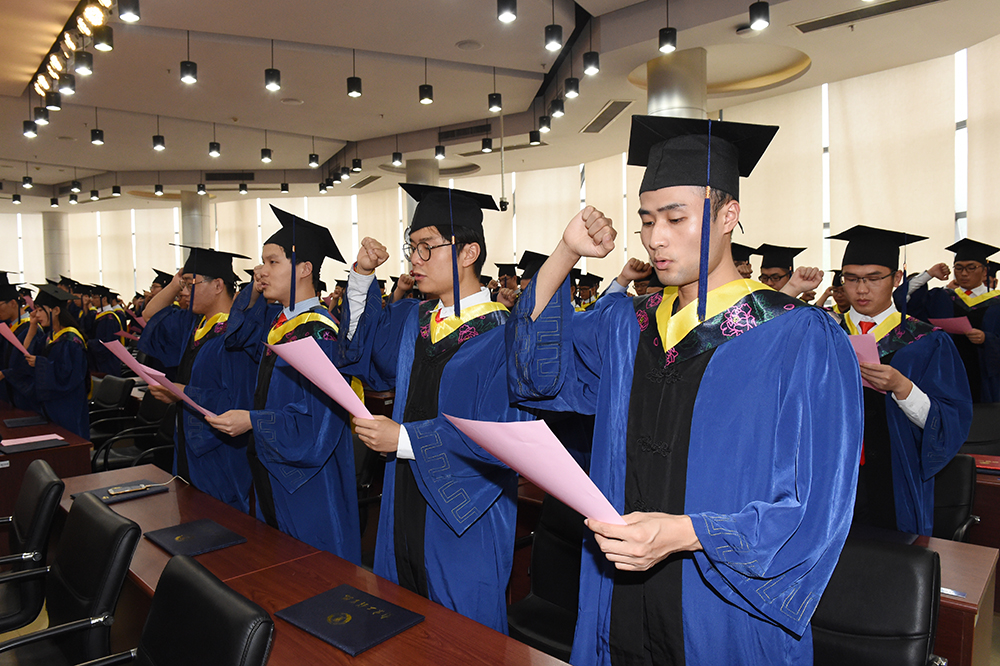 党委常委、副院长杨征宇宣读校学位委员会决议之后,与会校领导为2019届硕士学位获得者一一拔流苏、颁发硕士学位证书并合影留念,参加典礼的师生和家长们纷纷举起相机、手机,拍下这激动人心的时刻。典礼最后,全体研究生庄严宣誓:“今天我以母校为荣,明天母校以我为傲。”