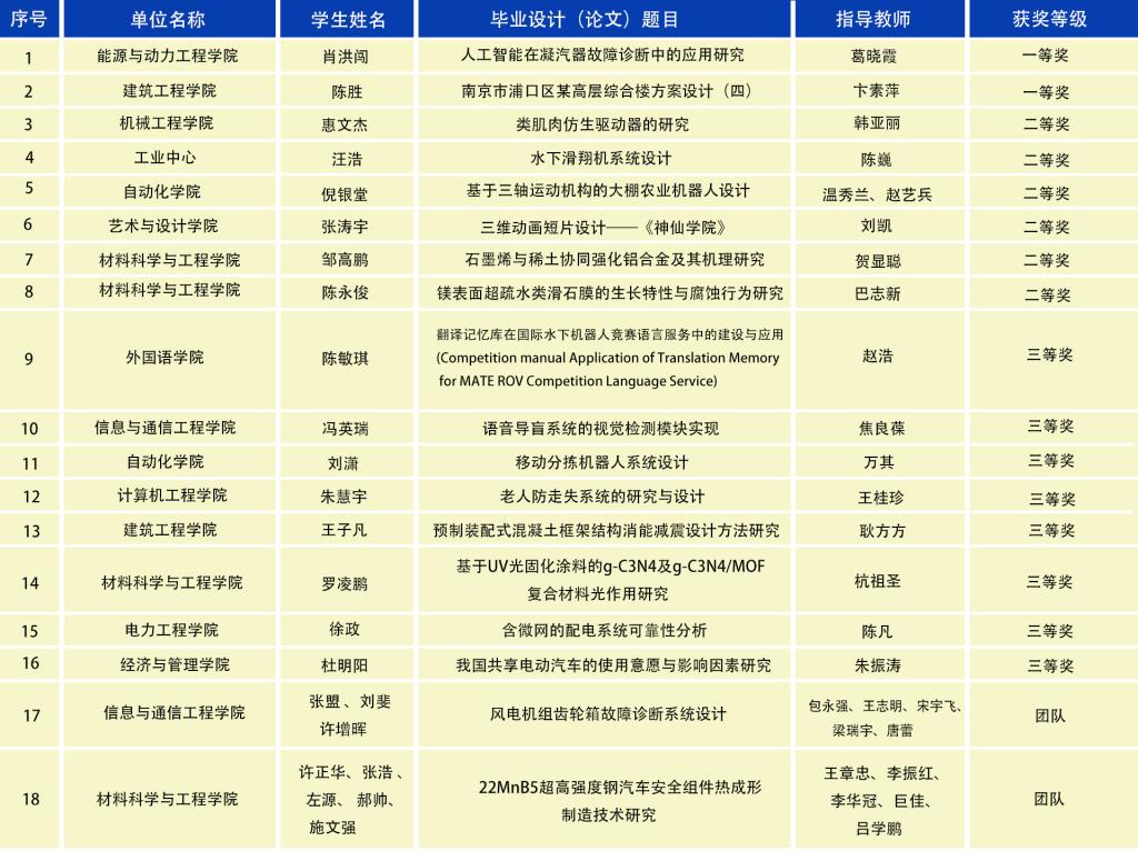 日前,省教育厅对2018年江苏省普通高校本专科优秀毕业设计(论文)评选结果进行公示,永利官网报送的23项本科毕业设计(论文)斩获18个奖项,其中一等奖2项、二等奖6项、三等奖8项、优秀团队2项。获奖数量及获奖等级均创历史新高,在同类高校中名列前茅。