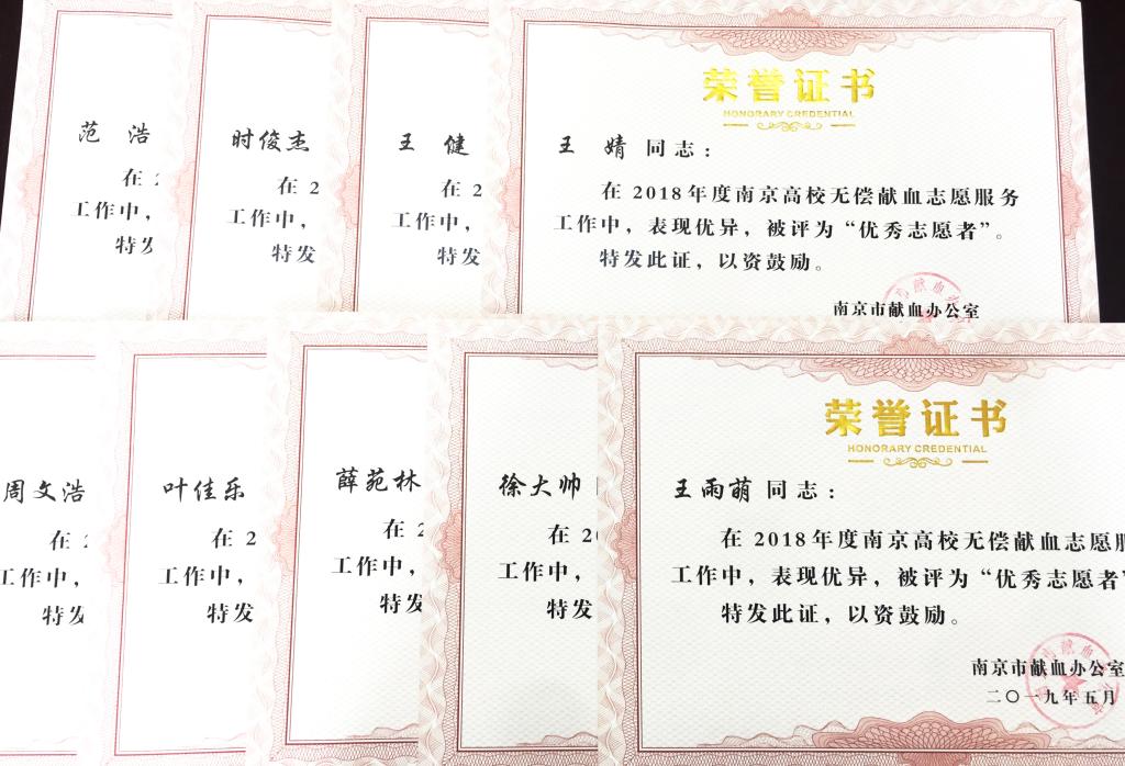 近日,南京市献血小组对2018年度全市无偿献血先进单位和先进个人予以通报表扬,永利官网喜获“南京市无偿献血先进单位”光荣称号。永利官网门诊部刘慧英老师被评为南京市无偿献血先进个人。同时,永利官网红十字会学生分会获得“南京市高校无偿献血优秀志愿者团队”光荣称号。范浩、时俊杰、王健、王婧、周文浩、叶佳乐、薛苑林、徐大帅、王雨萌九位同学被评为南京市高校无偿献血优秀志愿者。