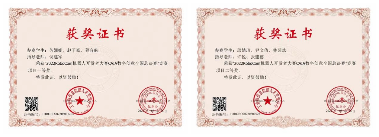2022RoboCom机器人开发者大赛CAIA数字创意全国总决赛由工业和信息化部人才交流中心、RoboCom国际公开赛组委会共同主办,来自全国78所高校206个代表团队和作品参加角逐。此次数字创意赛道,分为中国传统文化、智能生活、AI视觉、未来体验等类别,聚焦中国历代绘画大系、智能网联汽车交互设计等专题。艺术与设计学院侯建军和许悦老师分别对学生团队开展了专业知识与设计技能培训,并利用假期时间对参赛作品不断打磨优化,最终获得国赛一等奖和二等奖。