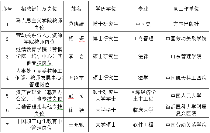 马克思主义学院(劳动教育中心)其他专技岗位,工会学院教师岗位(青年学术骨干岗),劳动关系与人力资源学院教师岗位(青年学术骨干岗),法学院教师岗位(青年学术骨干岗),经济管理学院教师岗位(青年学术骨干岗1)、经济管理学院教师岗位(青年学术骨干岗2),公共管理学院教师岗位(青年学术骨干岗),社会工作学院教师岗位(青年学术骨干岗),科研处(劳动关系与工会研究院)其他专技岗位因初试人员不足3人,取消该岗位此次招聘。