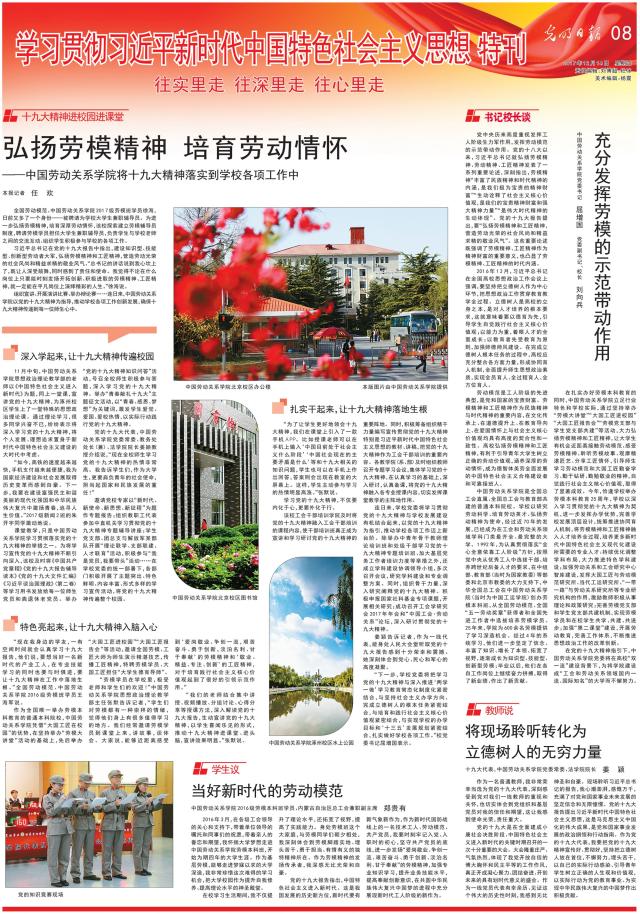 12月14日,《光明日报》“学习贯彻习近平新时代中国特色社会主义思想特刊”整版报道了beat365深入推进党的十九大精神进校园、进课堂的典型做法。学校党委书记屈增国,党委副书记、校长刘向兵发表了题为《充分发挥劳模的示范带动作用》的署名文章。